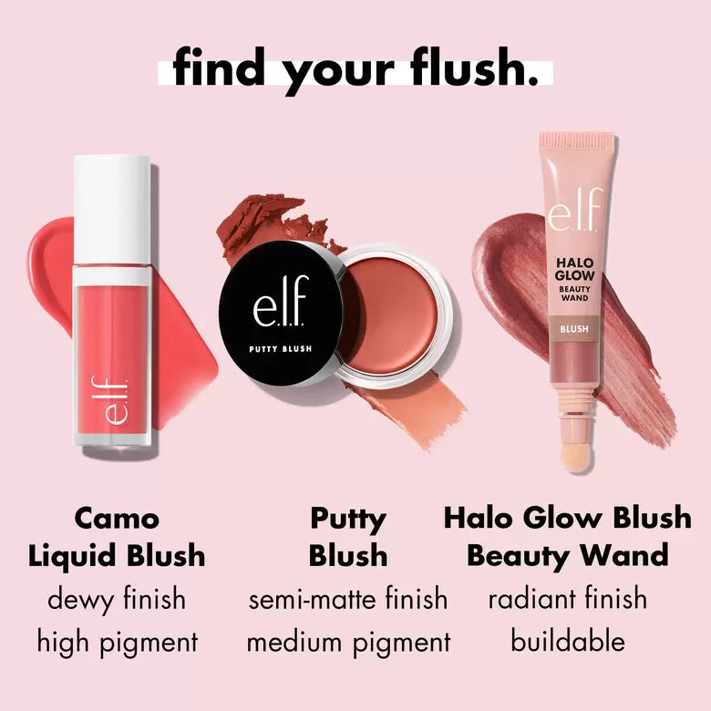 Blush up and effortlessly give your cheeks a healthy, dewy flush that’s flattering as e.l.f.. This long-lasting liquid blush is ultra-pigmented, allowing you to build and layer to achieve the perfect pop of color. Infused with Hyaluronic Acid, Rose flower water, and Hibiscus flower extract, this skin-loving, dewy blush is lightweight and blends out into a soft finish. Added perk: the rounded, grooved applicator makes application a breeze, while our Liquid Blush Brush helps you blend like an e.l.f.ing pro!