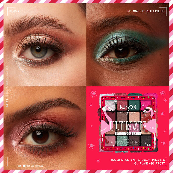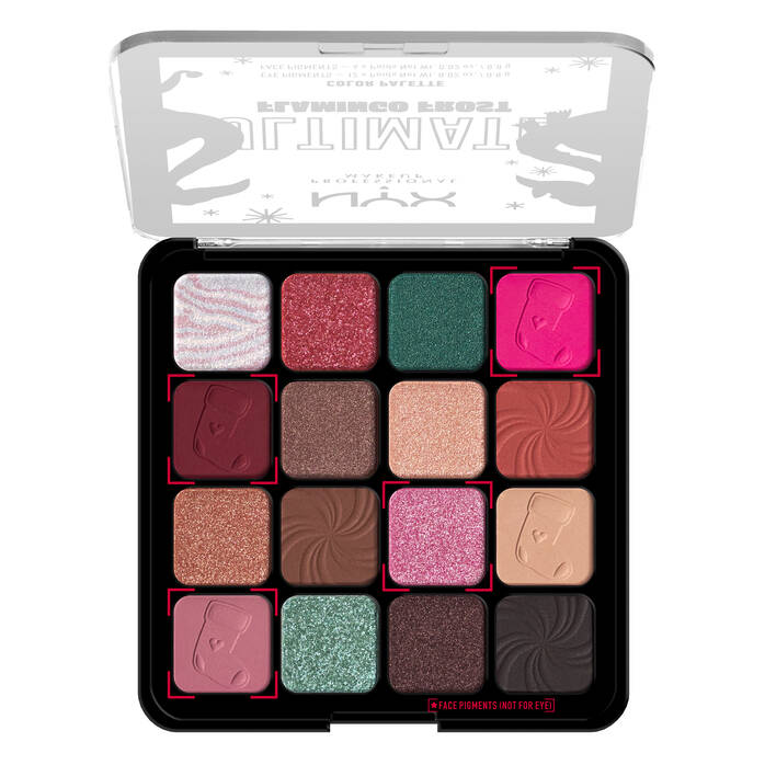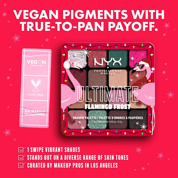 Hope you're holding onto the sunny Los Angeles holiday spirit because the icy flamingo frost is coming to your holiday looks! Gift the flamingo frost vegan, 16-pan color palette that transports you straight to our NYX FA. LA. LA. LA. Land Workshop. From icy shimmery shades that bring the chill, to unexpected vibrant flamingo pinks that bring the fun, these shades bring the joy of the holidays. The ultra blendable pigments and true-to-pan payoff are just a couple reasons to spread the flamingo holiday spirit this year! It truly doesn't get better than this. If you want the chill of the north pole with the warmth of la, these vegan & cruelty free formulas are made for you.