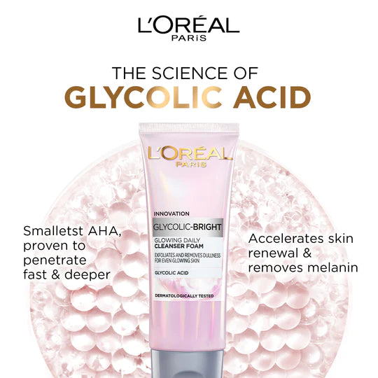 L’Oreal Skincare Laboratories developed Glycolic Bright Glowing Daily Cleanser Foam to gently exfoliate and deeply cleanse skin. With dense creamy foam, thoroughly clears impurities and make-up.